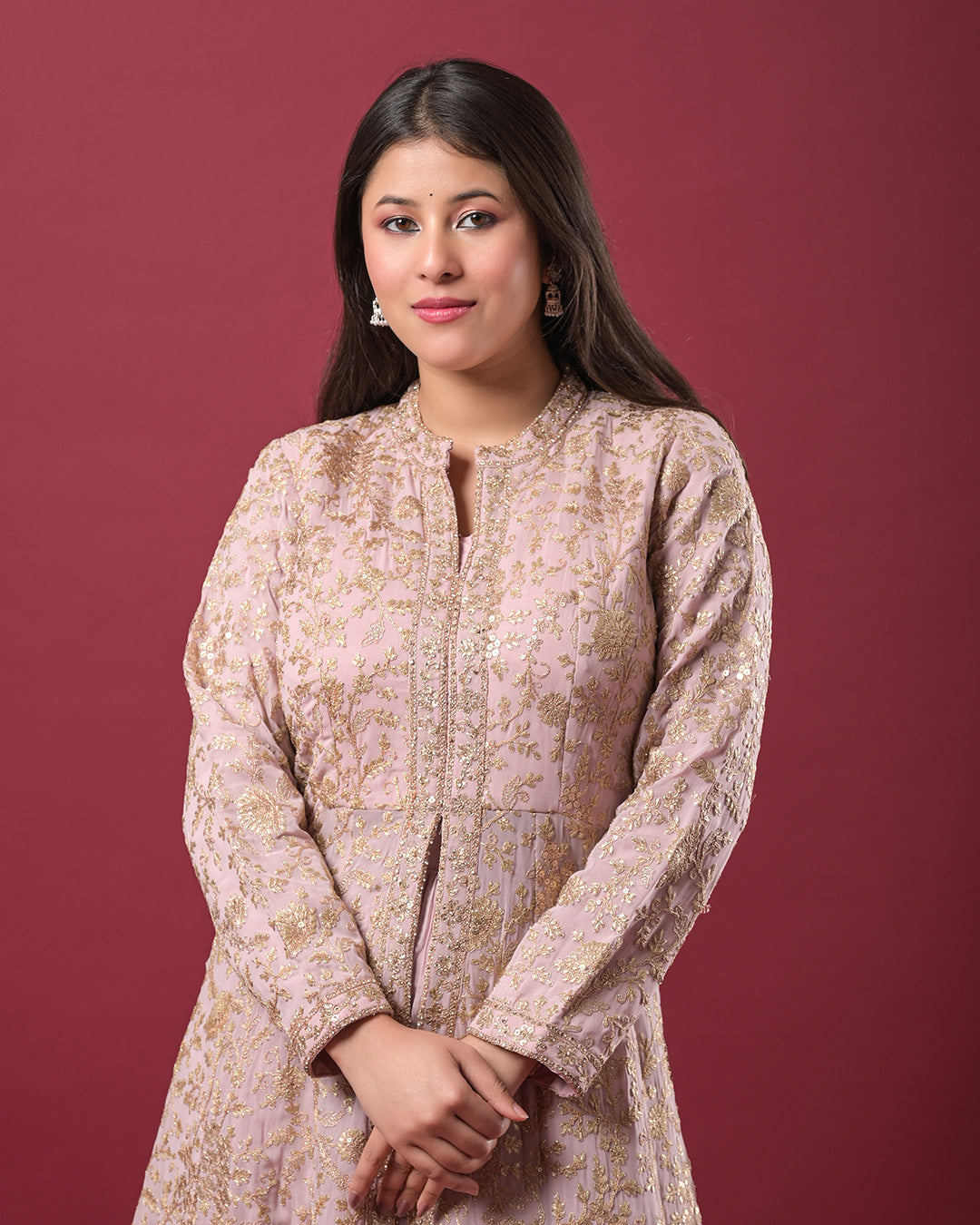 - Embellishment: All-over gold sequin embroidery for a regal finish
