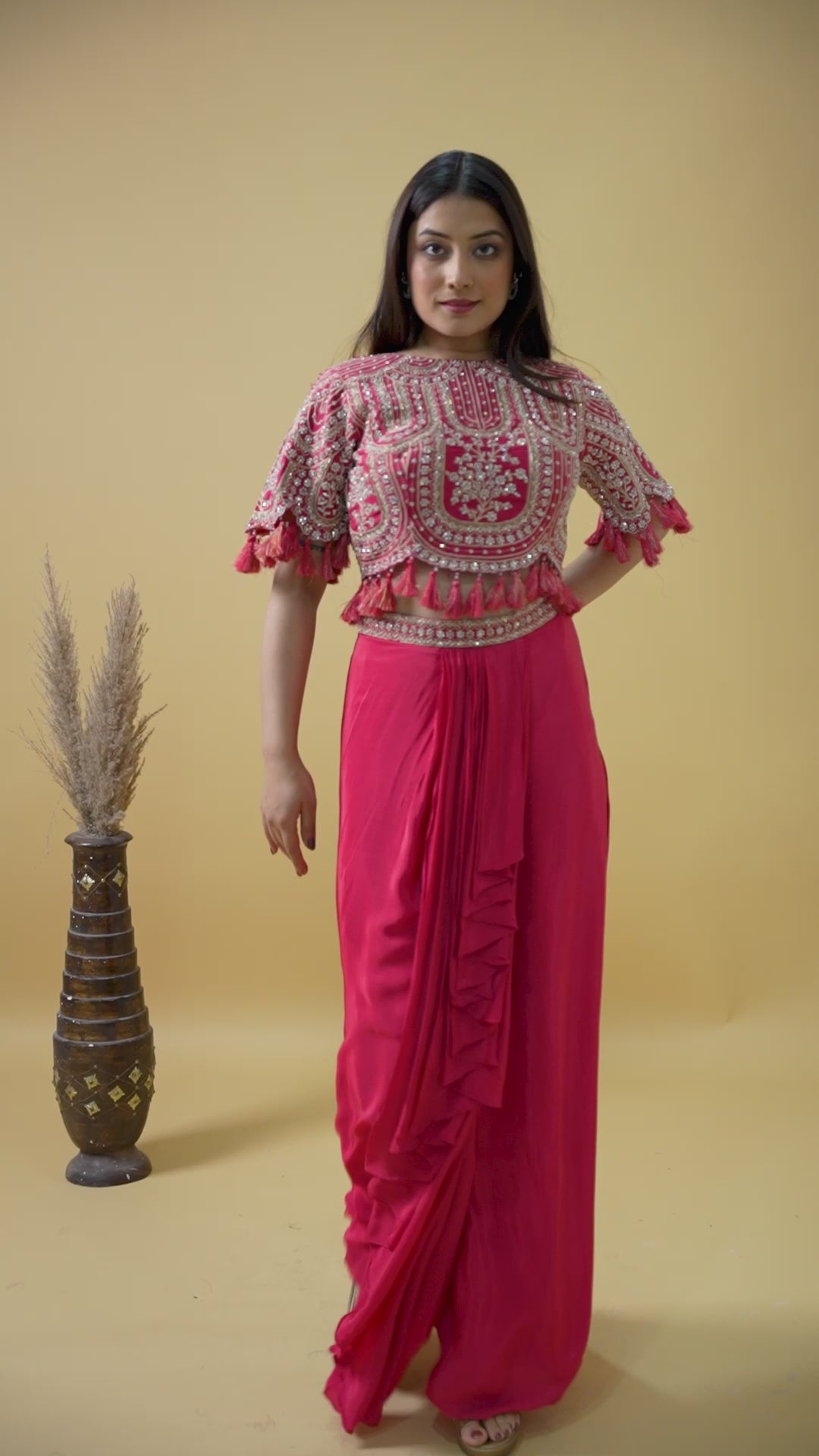 Turn heads in this rose pink Indo-Western draped skirt set, crafted in luxurious satin crepe for an effortlessly fluid silhouette. The asymmetrically draped skirt, featuring soft pleats and cascading ruffles, adds a contemporary touch to this elegant ensemble. Paired with a heavily embroidered crop top, adorned with intricate threadwork, sequins, and mirror embellishments, this outfit strikes the perfect balance between tradition and modern flair. The statement tassel detailing on the blouse enhances the boho-chic appeal, making it a stunning choice for festive celebrations, sangeet nights, and cocktail events.