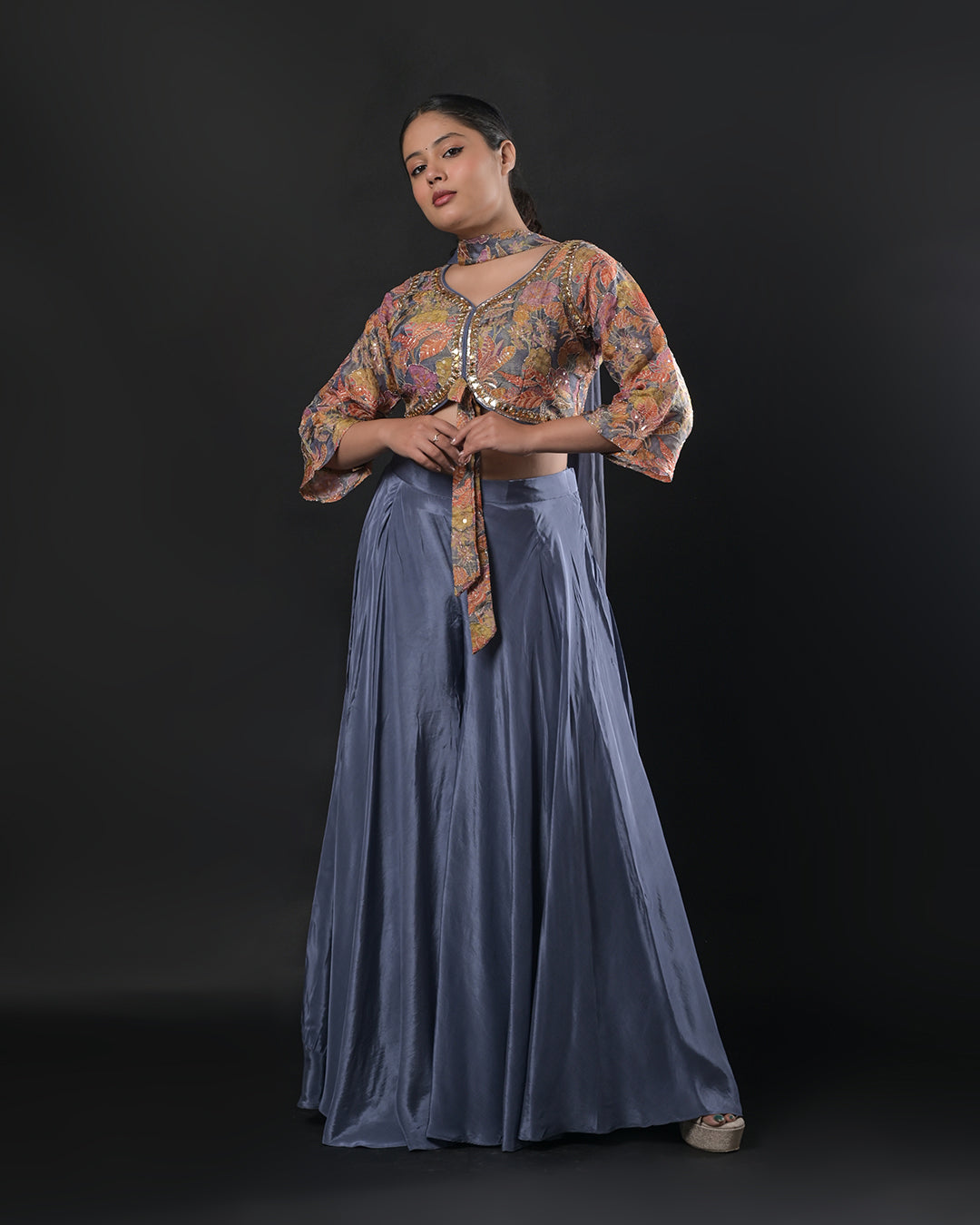 Channel effortless elegance with the Dusky Iris Palazzo Crop Top Set, a contemporary fusion of grace and charm. The intricately printed crop top, adorned with delicate embellishments, features flared three-quarter sleeves and a stylish tie-up front, adding a touch of bohemian allure. Paired with a full-flared, silky palazzo in a stunning dusk-blue hue, this ensemble moves fluidly, creating an ethereal silhouette. Completing the look is a choker-style dupatta, offering a unique and modern drape that elevates the ensemble’s sophistication. Perfect for festive soirées, cocktail nights, and celebratory occasions, this set ensures a statement look with effortless charm.