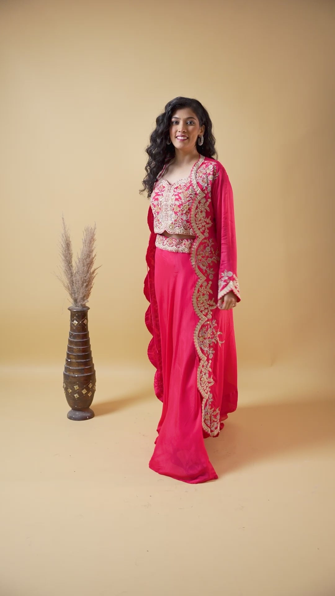 Exude effortless elegance with this rose pink Indo-Western skirt set, crafted in luxurious satin crepe for a rich and graceful drape. The ensemble features a heavily embroidered crop blouse, adorned with intricate thread and mirror work, adding a touch of regal charm. The flowy flared skirt offers comfort with a contemporary twist, while the embroidered shrug, detailed with exquisite border work, enhances the outfit’s versatility. Whether styled with the shrug for a structured look or without for a sleek and modern appeal, this outfit is perfect for weddings, festive soirées, and engagement celebrations.