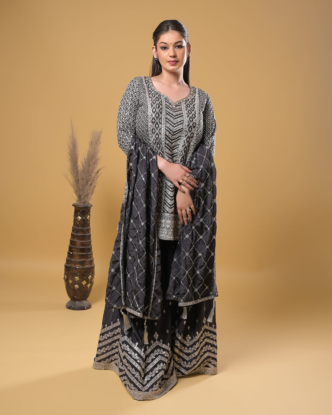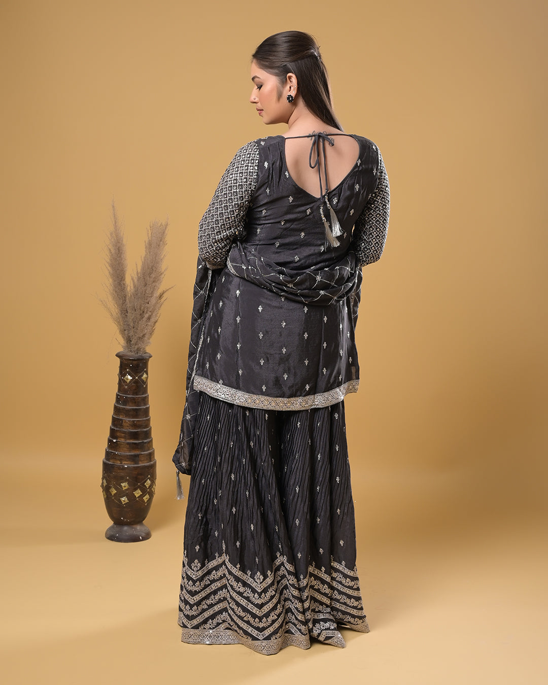 Embrace timeless elegance with this dark grey Indo-Western palazzo kurta set, a perfect blend of tradition and modern sophistication. The heavily embroidered kurta, adorned with intricate geometric thread and sequin work, exudes regal charm. Paired with flowy pleated palazzos, featuring detailed borders and subtle embellishments, this ensemble creates a graceful silhouette. The look is completed with a matching embroidered dupatta, adding a refined touch. Ideal for weddings, festive gatherings, and evening celebrations, this set is a statement of effortless glamour and sophistication.