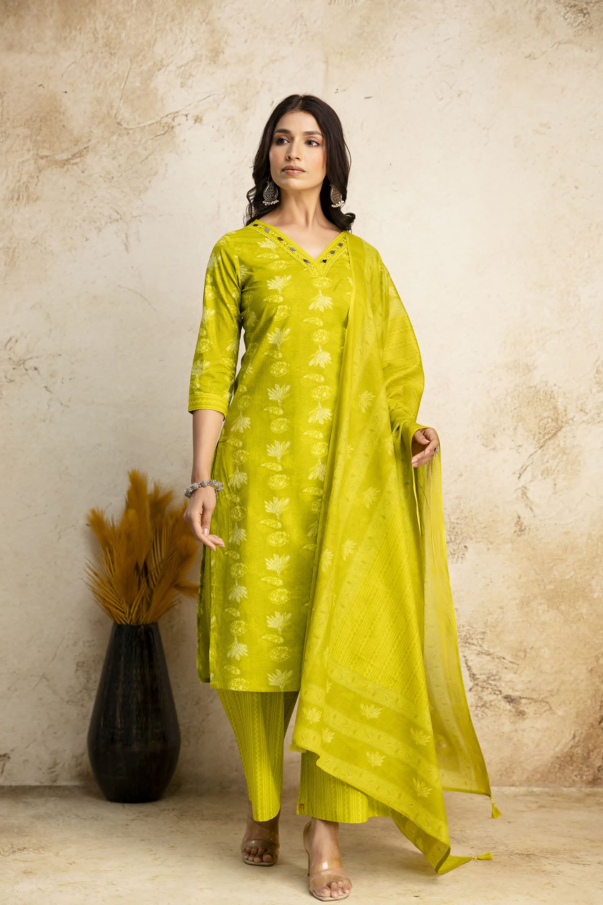 Elevate your ethnic wardrobe with the Olive Radiance suit, a perfect blend of tradition and modern elegance. This pure cotton straight-cut ensemble, in a rich olive green hue, features intricate block print motifs that add a touch of timeless charm. The delicately embroidered V-neckline enhances its sophistication, while the breathable fabric ensures all-day comfort. Complete with a matching dupatta and straight-fit pants, this set is ideal for casual outings and festive celebrations alike.