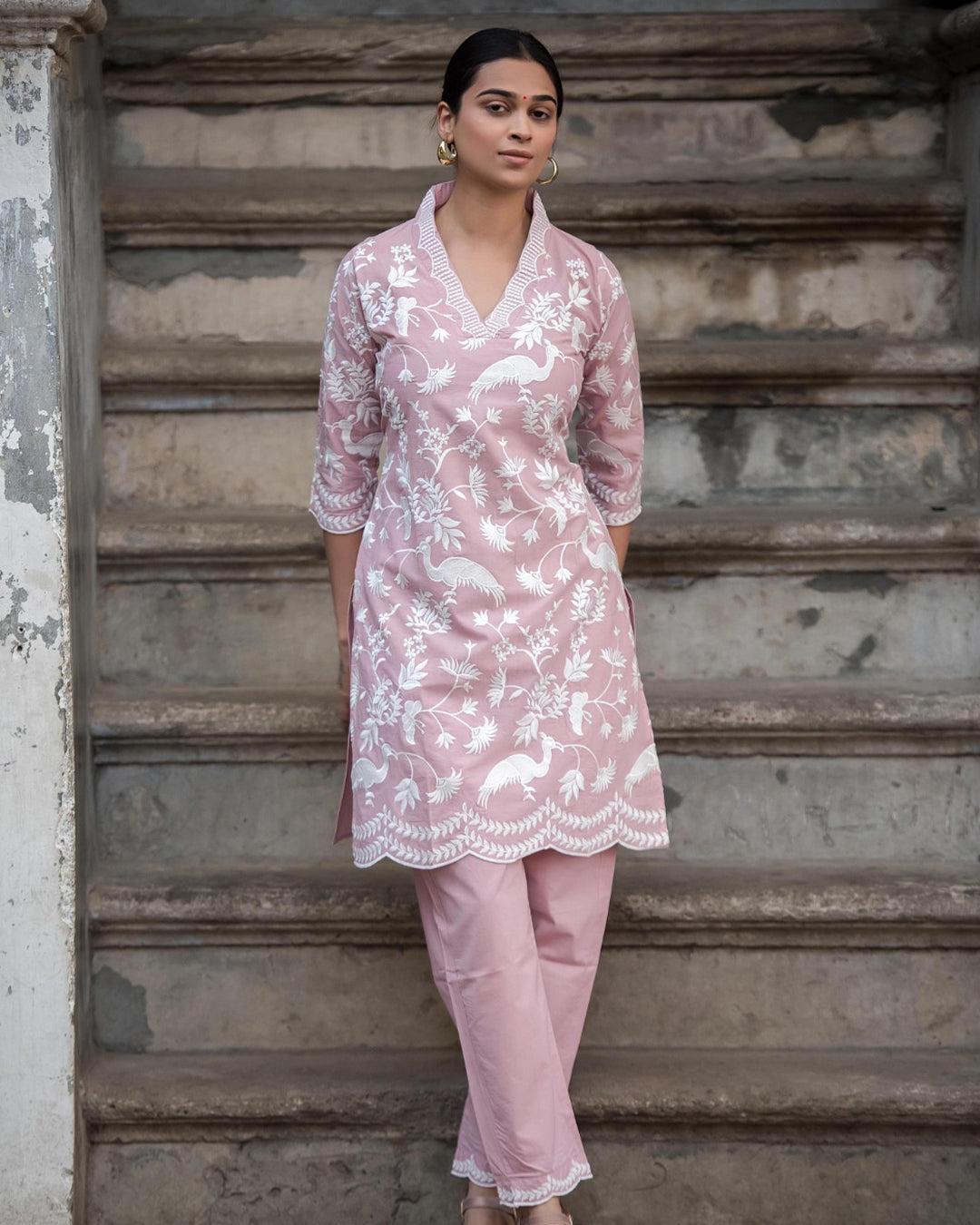 Soft, sophisticated, and effortlessly graceful, the Blush Elegance co-ord set is a dreamy addition to your wardrobe. Crafted from premium cotton in a delicate rose pink shade, this set features intricate white embroidery that adds a touch of timeless charm. The kurta’s scalloped hem and elegant motifs enhance its appeal, while the matching straight-fit pants complete the look with understated sophistication.