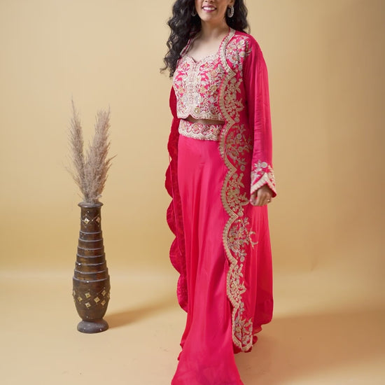 Exude effortless elegance with this rose pink Indo-Western skirt set, crafted in luxurious satin crepe for a rich and graceful drape. The ensemble features a heavily embroidered crop blouse, adorned with intricate thread and mirror work, adding a touch of regal charm. The flowy flared skirt offers comfort with a contemporary twist, while the embroidered shrug, detailed with exquisite border work, enhances the outfit’s versatility. Whether styled with the shrug for a structured look or without for a sleek and modern appeal, this outfit is perfect for weddings, festive soirées, and engagement celebrations.
