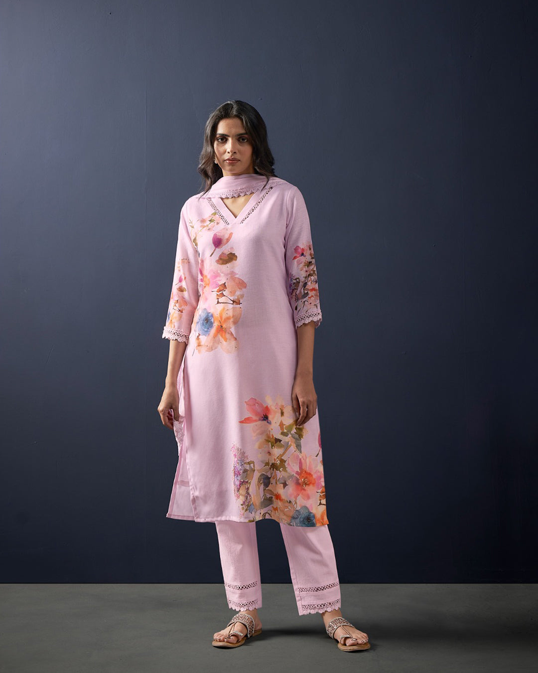 - Fabric: Printed linen kurta & pants with a soft chiffon dupatta
