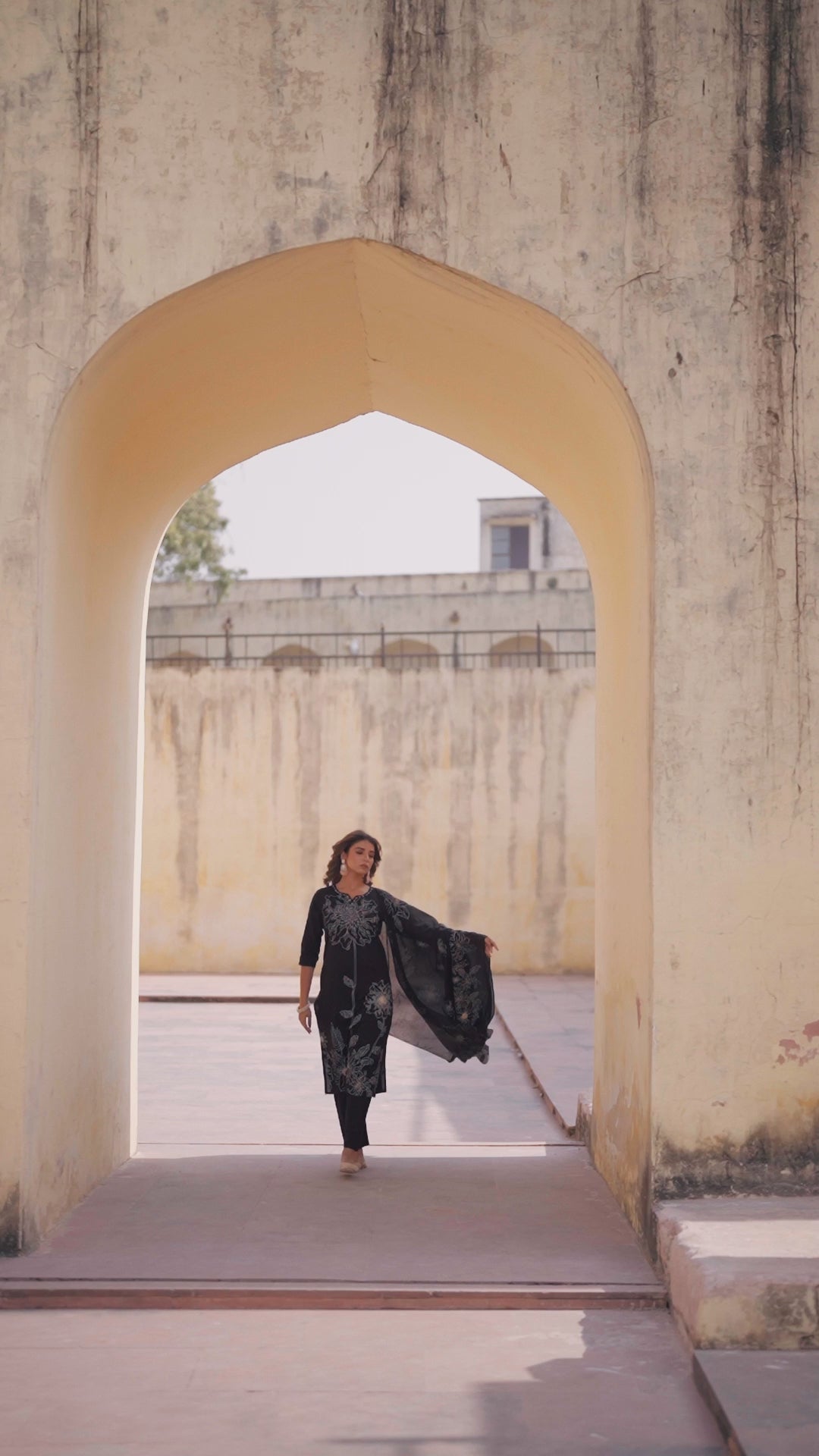 - Kurta: Made from soft, breathable cotton, the kurta features intricate white floral thread embroidery, adding a graceful touch to its classic black base.