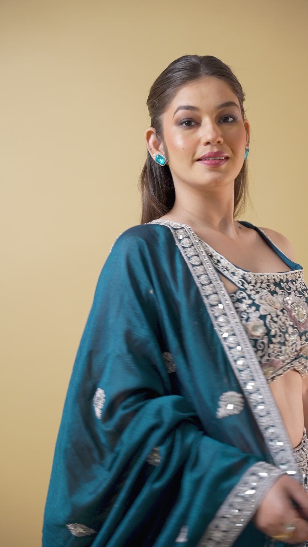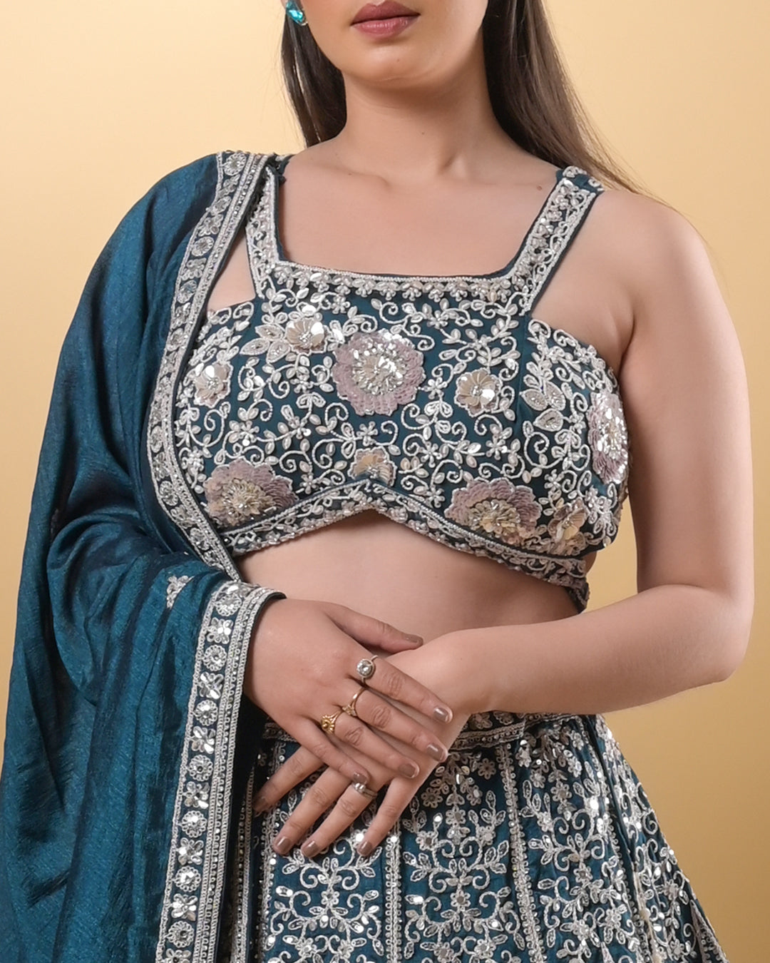 Drape yourself in pure opulence with this teal blue heavy embroidered lehenga, a masterpiece of intricate craftsmanship and regal elegance. The richly detailed hand-embroidered motifs adorn the entire lehenga, creating a stunning visual symphony of traditional artistry. The square-neck crop blouse, embellished with delicate embroidery, complements the grandeur of the lehenga, while the graceful dupatta adds an ethereal charm. Designed for grandeur, this ensemble is perfect for weddings, receptions, and royal celebrations, making you the epitome of grace and sophistication.