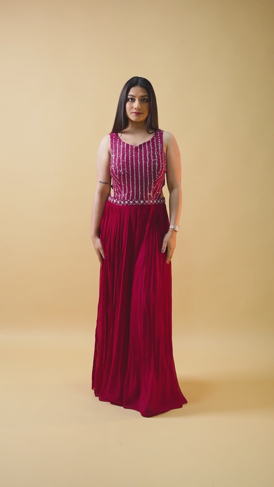 Drape yourself in the elegance of this cherry red Indo-Western jumpsuit, a seamless blend of ethnic heritage and modern sophistication. The hand-embellished bodice is adorned with delicate mirror work and sequins, adding a radiant charm to your look. The flowy pleated bottom gives the illusion of a gown while maintaining the comfort of a jumpsuit. Featuring side cut-outs and a sleeveless silhouette, this piece is perfect for festive celebrations, weddings, and evening soirées, ensuring you shine with every step.