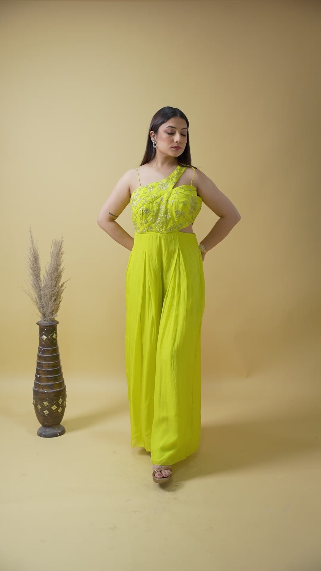 Brighten up any occasion with this sunshine yellow Indo-Western jumpsuit, a perfect blend of modern flair and ethnic charm. The one-shoulder embroidered bodice, adorned with delicate sequin and threadwork, adds a touch of glamour, while the flowy wide-leg silhouette ensures effortless elegance and comfort. The cut-out detailing at the waist enhances the contemporary appeal, making this outfit a stunning choice for festive celebrations, cocktail parties, and destination weddings.
