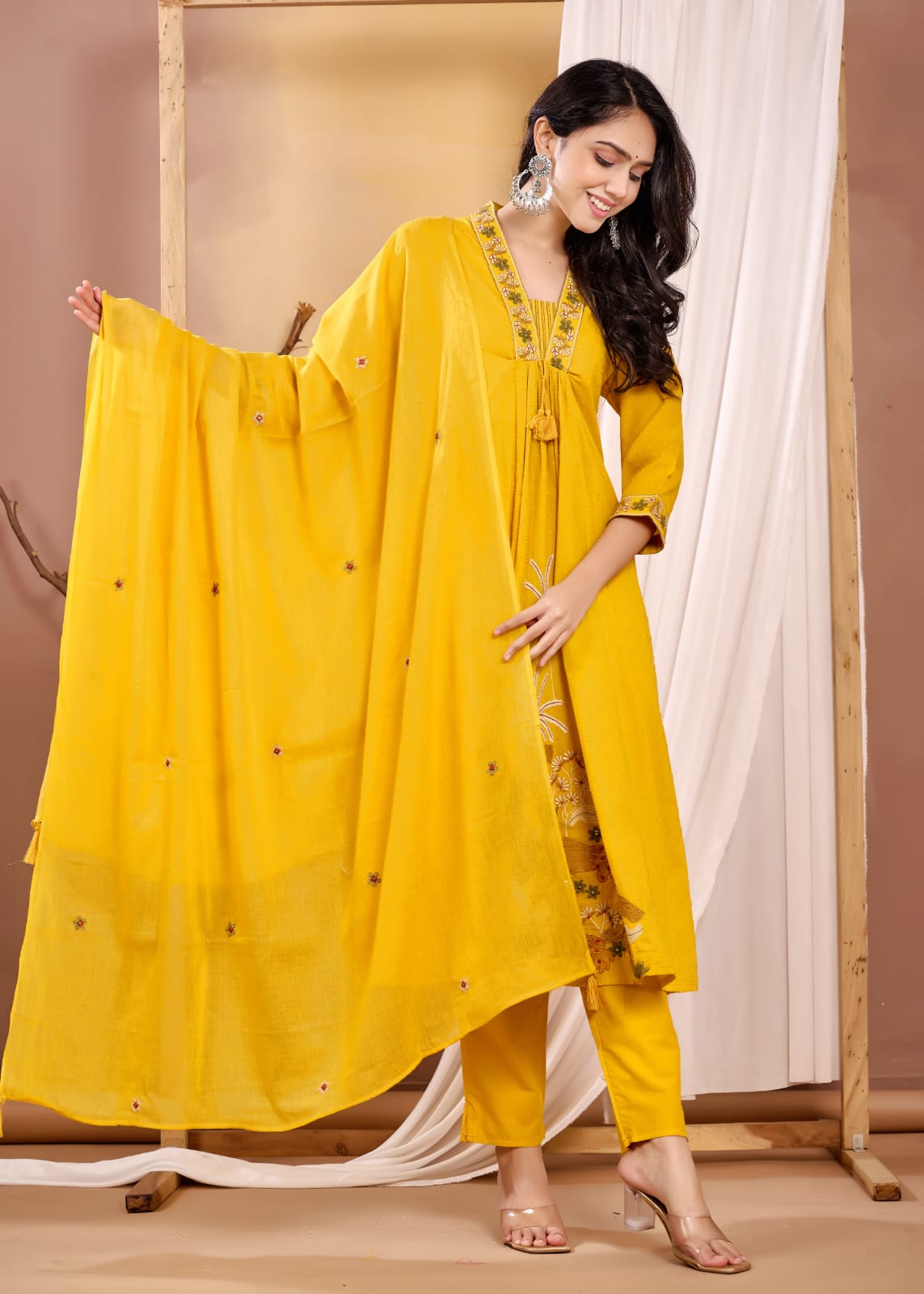 Step into the vibrancy of tradition with the Sunshine Bloom Frock Suit, crafted in soft cotton for an effortlessly elegant look. The mustard yellow hue radiates warmth and joy, while the intricate floral embroidery along the hemline adds a refined touch. Featuring a V-neckline with delicate embellishments, pleated detailing, and tassel accents, this flowing frock suit ensures both comfort and grace. Complete with matching pants and a lightweight embroidered dupatta, this ensemble is perfect for festive celebrations and day-to-day elegance.